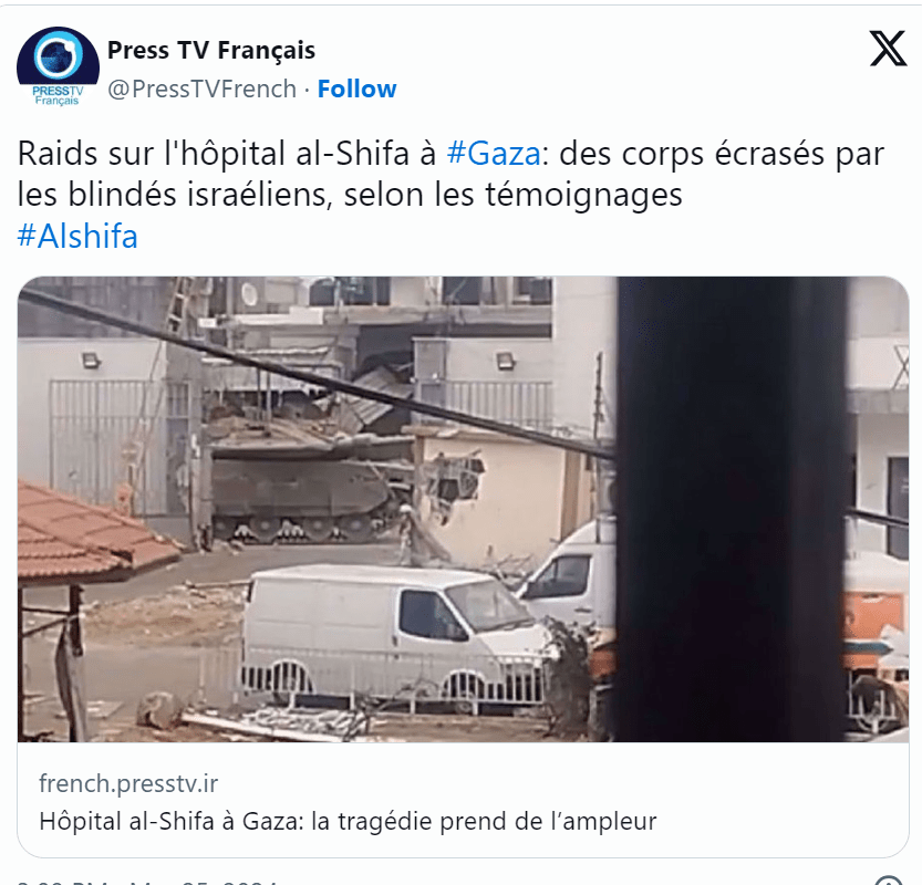 Ses remarques interviennent après que les forces israéliennes ont pris d’assaut l’hôpital Al-Shifa à l’aide de chars et de drones alors qu’environ 3 000 personnes se trouvaient à l’intérieur des locaux de l’hôpital. Ceux qui tentaient de partir ont été pris pour cible par des tireurs embusqués et par des tirs d’hélicoptères.