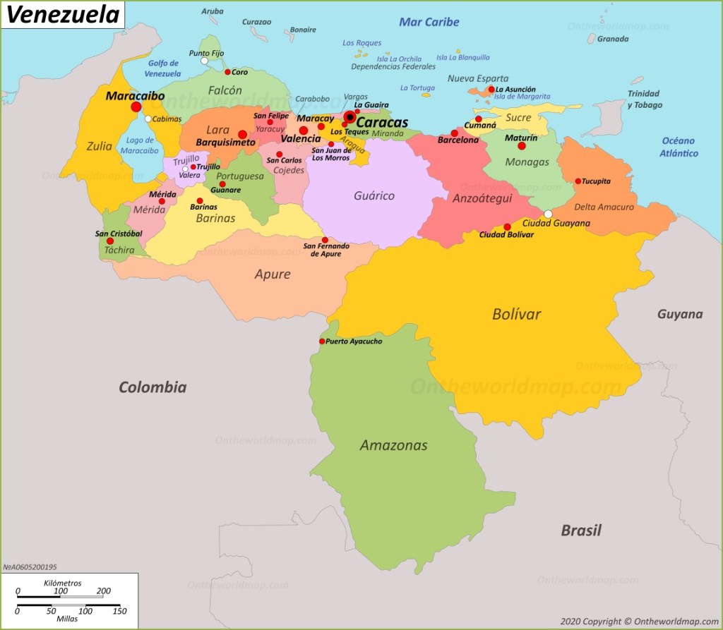 Le Venezuela ou la république bolivarienne du Venezuela, en l’honneur de Simón Bolívar, est une république fédérale située au Nord de l’Amérique du Sud, bordé par la mer des Caraïbes, à l’est-sud-est par le Guyana, au sud par le Brésil, au sud-ouest et à l’ouest par la Colombie.La langue nationale du Venezuela est l’espagnol et sa capitale et principale métropole est Caracas. Le pays est majoritairement de religion catholique. Sa population est composée essentiellement de métis. Le Venezuela est une puissance énergétique majeure avec des réserves prouvées de 302 milliards de barils de pétrole, ce qui en fait le 1° pays au monde dans le classement par réserves de pétrole prouvées devant l’Arabie saoudite, mais 3/4 de ces réserves sont des sables bitumineux, dont l’exploitation est malaisée et très polluante.
