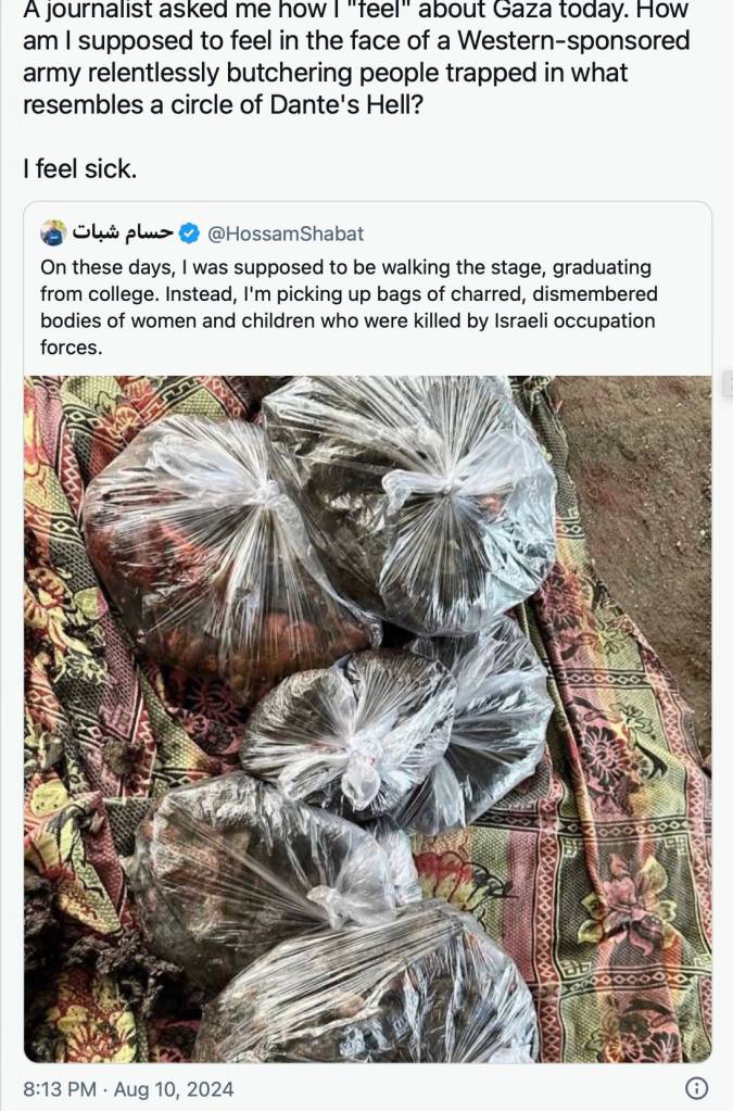 La technologie nous a apporté le génocide de Gaza – qui a jusqu’à présent tué moins de monde que tous ces massacres perpétrés par les membres de l’OTAN – avec des détails qui nous arrachent les tripes. Je viens de regarder des sacs de 75 kg de viande humaine mélangée remis à des proches en lieu et place d’un cadavre identifiable, et je suis en état de choc. Ce n’est pas le pire que nous ayons vu à Gaza.