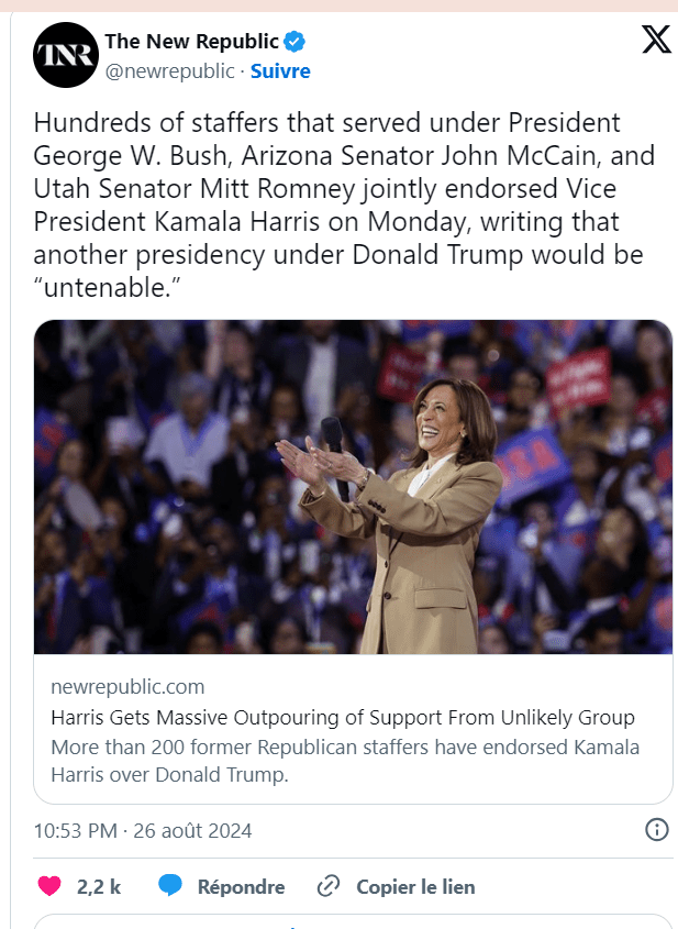 Les Cheneys rejoignent une liste croissante d’anciens bellicistes républicains qui migrent en masse vers le Parti démocrate pour soutenir Harris. Le mois dernier, des centaines de collaborateurs qui ont servi sous les républicains George W. Bush, John McCain et Mitt Romney ont signé une lettre de soutien à Harris, affirmant que « la réélection du président Trump serait un désastre pour notre nation ».