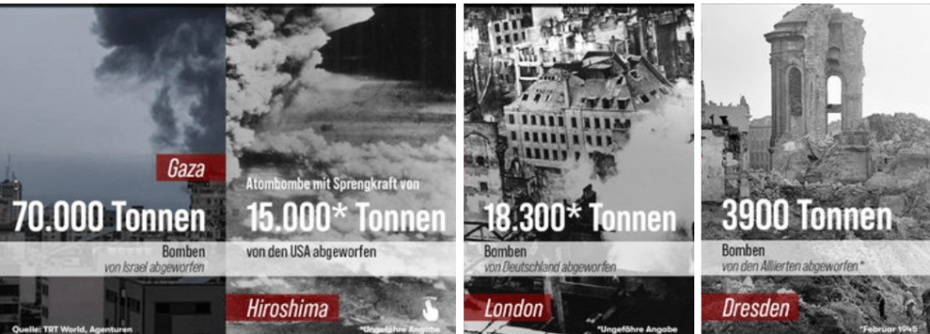 70.000 tonnes de bombes depuis octobre 2023, presque le double de ce qui a été largué à Hiroshima/Nagazaki (USA), Londres (Nazis) et Dresde (Alliés) pendant la 2ème Guerre mondiale, ont été larguées sur Ghaza par les descendants des anciennes victimes de l’Holocauste avec le soutien massif occidental et il faut le souligner sous l’indifférence générale.