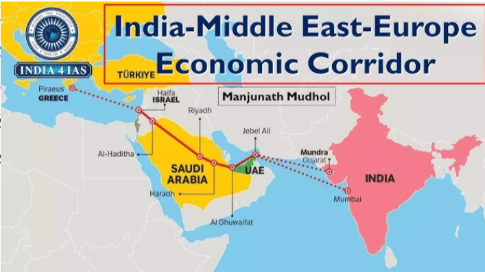 mis au point lors du sommet G20 en Inde en septembre 2023. Le corridor, une alternative au Canal de Suez (un inconvénient économique inquiétant pour l’Égypte) et au Canal Ben Gourion, discutée lors du G20 en Inde en septembre 2023, devrait permettre d’atteindre le continent européen en 10 jours seulement, depuis l’Inde jusqu’en Grèce, un temps plus court par rapport au trajet via le Canal de Suez. Pour la mise au point de ce projet, la construction des voies ferrées traversant les Émirats, l’Arabie Saoudite, la Jordanie et Israël sera nécessaire.