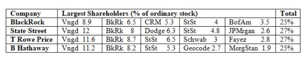 Ainsi, le petit échantillon d’entreprises de la figure précédente révèle que les mêmes institutions financières figurent en bonne place parmi les quatre plus gros actionnaires de la plupart des dix-huit sociétés cotées en bourse étudiées. Plus précisément, Vanguard figure parmi les quatre plus gros actionnaires de toutes les sociétés sauf une (et est le plus gros actionnaire institutionnel de toutes les sociétés sauf trois), et BlackRock apparaît dans toutes les sociétés sauf deux. Ensemble, elles détiennent généralement entre 15 et 20 % des actions. Les autres sociétés les plus importantes de la liste sont (par ordre décroissant) State Street Corporation (douze), Capital RM (sept) et Fidelity MR (quatre).