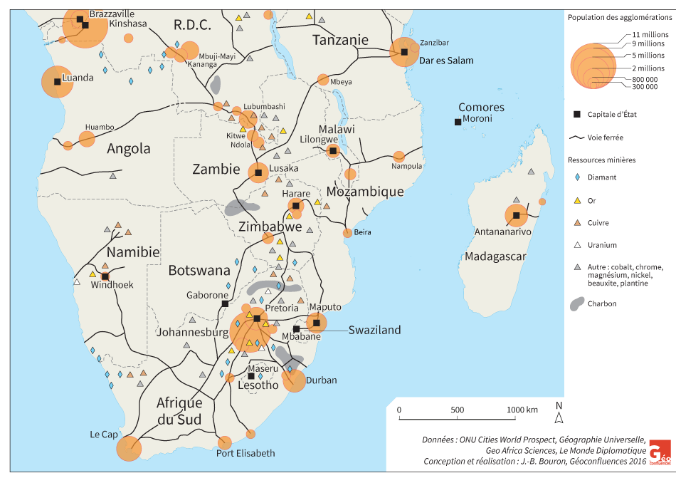 Ajourdhui, il est composé des pays suivants : Afrique du Sud, Angola, Botswana, Lesotho, Malawi, Mozambique, Namibie, Swaziland, Zambie et Zimbabwe dont les frontières ont évolué au gré des découpages arbitraires des Européens. Cette partie de l’ Afrique , riche en ressources minières et aurifères a été l’Afrique des régimes ségrégationnistes (l’apartheid jusqu’en 1991) et en a gardé de graves séquelles (inégalités socio-spatiales marquées). La pandémie d’un “sida africain” les affecte terriblement. L’indépendance des pays qui la composent est relativement récente et s’est suivie de longues années de guerres civiles: Mozambique:1975+ guerre civile de 1976 à 1992, Angola: 1975 + 27 ans de guerre, Zimbabwe: 1980, Namibie: 1990. Des circuits de populations autour des mines, africaines et européennes, ont contribué à en faire un ensemble inscrit de longue date dans des flux mondialisés.