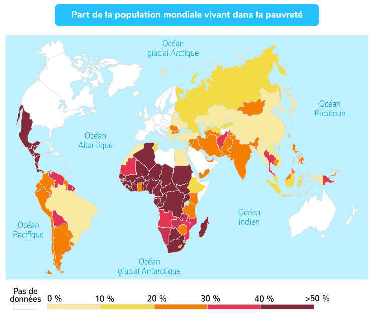 La plupart des pays souffrant de la pauvreté se trouvent en Afrique (et en Asie du Sud). En termes de nombre de personnes concernées, l’Afrique subsaharienne est de loin la région la plus touchée de la planète. 2/3 des personnes en situation d’extrême pauvreté y vivent.