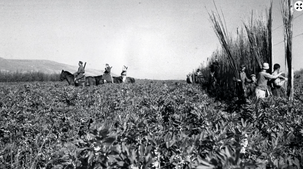 Degania, février 1948. Des paysans construisant une barrière et des hommes en armes dans un champ.