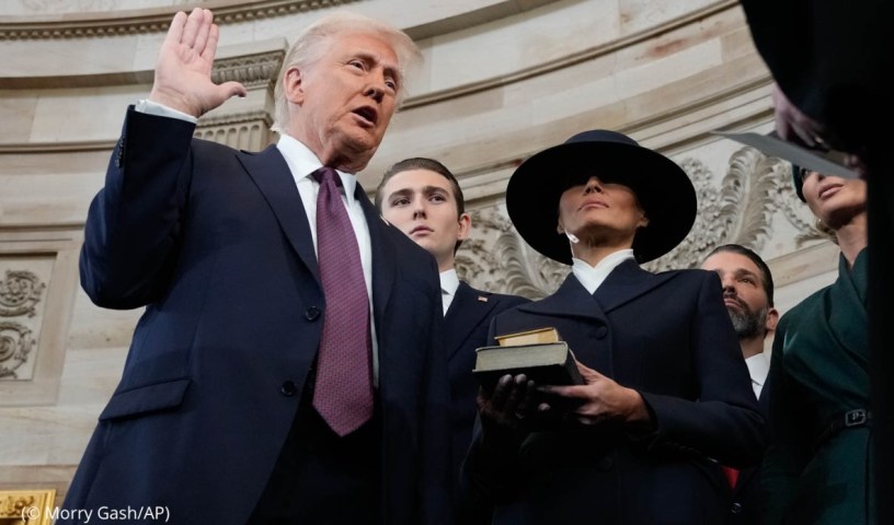 عاد دونالد ترامب إلى البيت الأبيض وأدّى اليمين الدستورية في « كابيتول هيل » يوم الاثنين 20 كانون الثاني/يناير 2025، ليصبح رسميًا الرئيس السابع والأربعين للولايات المتحدة، وأعلن في خطاب تنصيبه « إن انحدار أميركا قد انتهى ويبدأ العصر الذهبي لأمريكا الآن… إن 20 كانون الثاني/يناير 2025 هو يوم التحرير… سنستعيد سيادتنا. سيتم استعادة أمننا »، وَوَقَّعَ فور تنصيبه العديد من المراسيم، من بينها الخروج من اتفاق باريس للمناخ وإعلان حالة طوارئ الطاقة، التي من المفترض أن تعزز إنتاج المحروقات في الولايات المتحدة، وأطلق حملة واسعة النطاق ضد المهاجرين وتضمّنت التّراجع عن الحقوق المُكتسبة لأبناء المهاجرين المولودين في الولايات المتحدة، واعتبر بعض اختصاصيِّي القانون إن هذا التّراجع يُعَدُّ خَرْقًا للتعديل الرابع عشر للدستور، كما أعلن حالة الطوارئ على حدود الولايات المتحدة مع المكسيك، واستئناف بناء الجدار على الحُدُود، كما أكد أنه يعتزم فرض رسوم جمركية بنسبة 25% على المنتجات القادمة من كندا والمكسيك المجاورتين اعتباراً من الأول من شهر شباط/فبراير 2025، في مخالفة صريحة لعلاقات الشراكة بين الدّول الثّلاث، ورَدّت الرئيسة المكسيكية كلوديا شينباوم على هذا الإستفزاز ب »ضرورة التّعقُّل والحفاظ على الهدوء » في مواجهة قرارات وسياسات دونالد ترامب التي بدأت منذ ولايته الأولي بين سنتَيْ 2017 و 2020 بشأن الهجرة وبشأن العلاقات التّجارية والرُّسُوم الجمركية وما إلى ذلك.