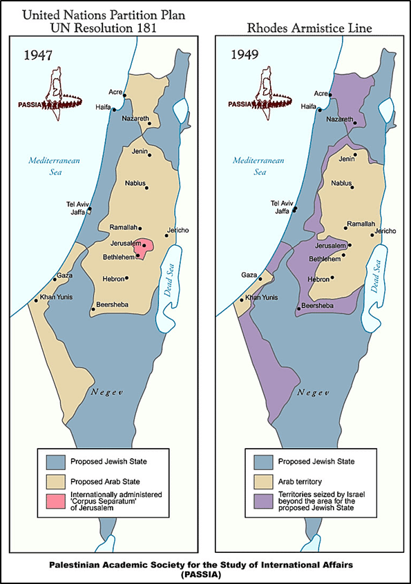 [20] – Résolution 181 de l’ONU du 29 novembre 1947 pour la création d’un État arabe, un État juif et une Zone internationale comprenant Jérusalem et les Lieux Saints en Palestine historique. 33 pays ont voté pour, 13 contre (dont 6 pays arabes, les 14 autres sont encore sous domination coloniale) et 10 se sont abstenus. L’ONU comptait 57 États membres conte 192 actuellement.