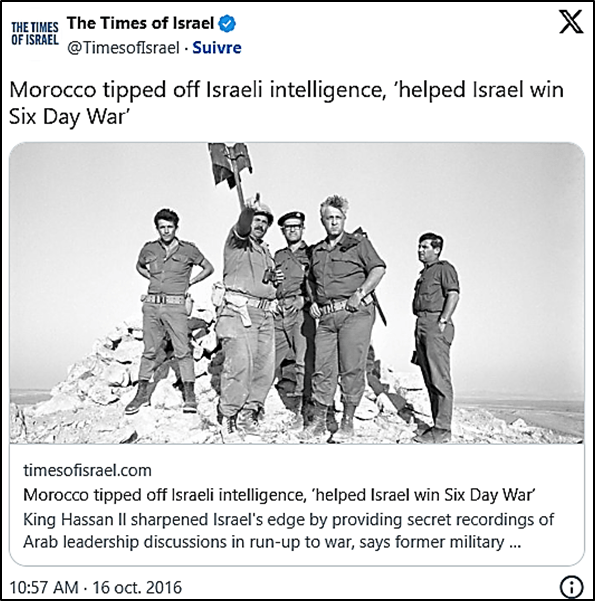 [31] – Voir Link : https://fr.timesofisrael.com/le-maroc-a-aide-israel-a-gagner-la-guerre-des-six-jours-en-prevenant-les-renseignements/