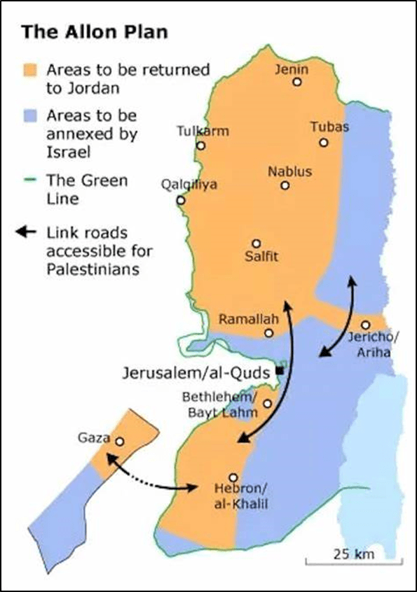 Les Plans d’Oslo de 1993 prévoyaient une ultérieure division de la zone jaune du Plan Allon en 2 zones (A et B), l’une avec une autonomie limitée et l’autre avec une administration mixte. La 3ème zone restera toujours sous contrôle total israélien et correspond presque parfaitement à la zone C du Plan d’Oslo.
