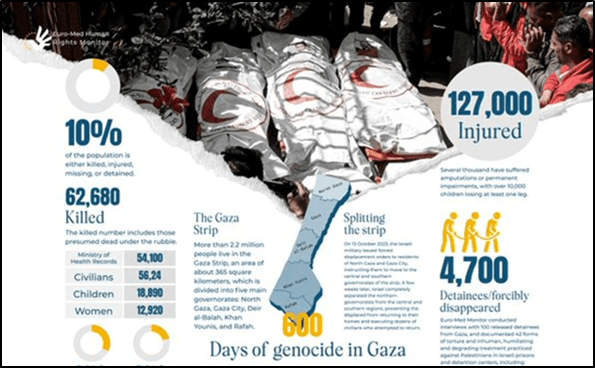 Euro-Med Human Right (voir tableau ci-joint) situe les chiffres au mois de mai 2025 à 62.680 morts et à 127.000 blessés.