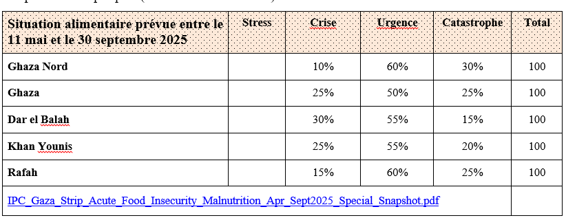 Le dernier instrument dans la barbarie génocidaire sioniste est l’utilisation à des fins politiques, de la faim pour affliger davantage la population palestinienne de Ghaza. Les prévisions pour la période entre les mois de mai et septembre 2025 sont des plus catastrophiques (voir tableau ci-dessous)