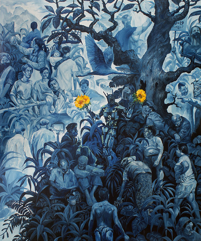 5-Bulletin d’art tricontinental Au cours de la dernière décennie, notre institut a travaillé dur pour s’assurer que nous intégrons la bataille des idées à la bataille des émotions, que l’art ne fonctionne pas simplement comme une décoration. Depuis mars 2024, notre département d’art produit un bulletin mensuel afin de fournir un contexte plus riche à l’art produit dans la tradition de la libération nationale. Ces bulletins, rédigés par le directeur artistique de notre institut, Tings Chak, sont basés sur des entretiens avec des artistes contemporains ainsi que sur des plongées profondes dans les archives de l’art révolutionnaire du monde entier. Le bulletin le plus récent, « Poésie contre le fascisme », s’ouvre sur une discussion sur Olga Bergholz de l’Union soviétique et se termine sur Sarojini Naidu de l’Inde. « Nous, qui ne sommes pas encore libres », écrivait Naidu, « nous vous saluons vous qui avez vaincu le tyran ».