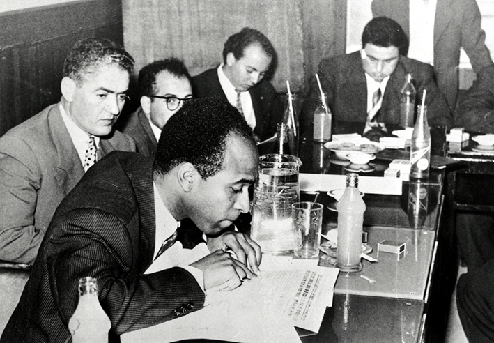 Frantz Fanon lors d’une conférence de presse d’écrivains à Tunis, 1959. Frantz Fanon Archives / IMEC