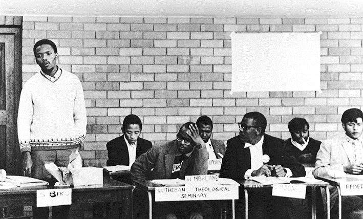 Stephen Biko (debout) lors de la conférence de 1971 de l’Organisation des étudiants sud-africains (SASO). La résidence Alan Taylor, où s’est tenu l’événement, était la résidence réservée aux étudiants en médecine de l’Université du Natal sous l’apartheid. Fondation Steve Biko