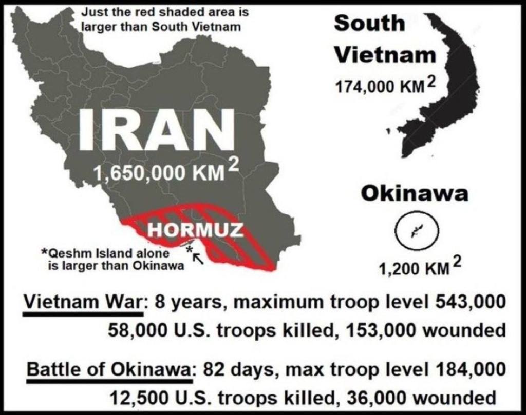 La seule manière d’atteindre Larak, c’est depuis Qeshm qui est plus grande qu’Okinawa. (Pendant la Seconde Guerre mondiale, il a fallu trois mois, 184 000 soldats et au moins 12 500 morts au combat pour prendre Okinawa). Qeshm est truffée d’innombrables missiles antinavires et drones iraniens enfouis dans des falaises et des grottes sur des centaines de kilomètres.